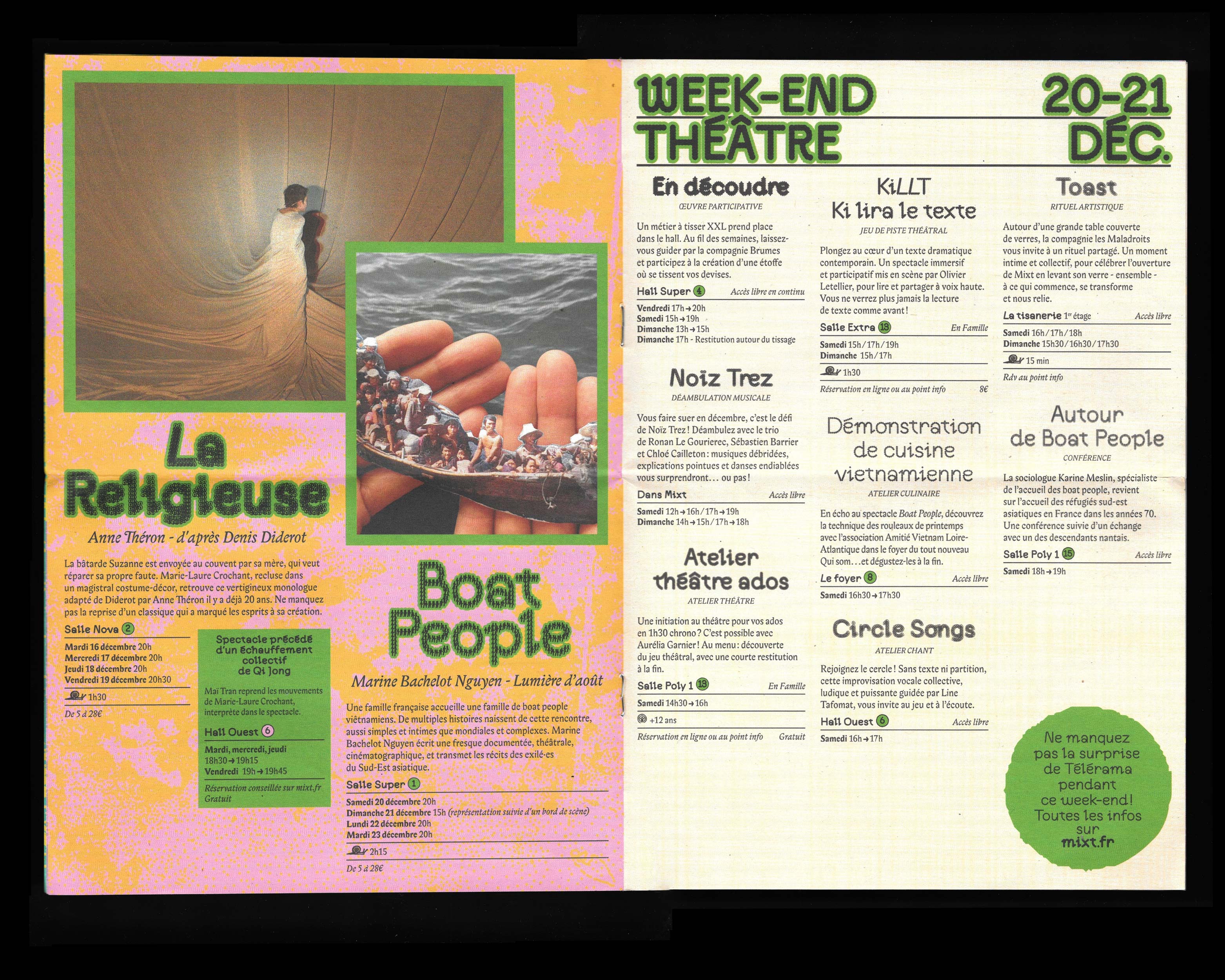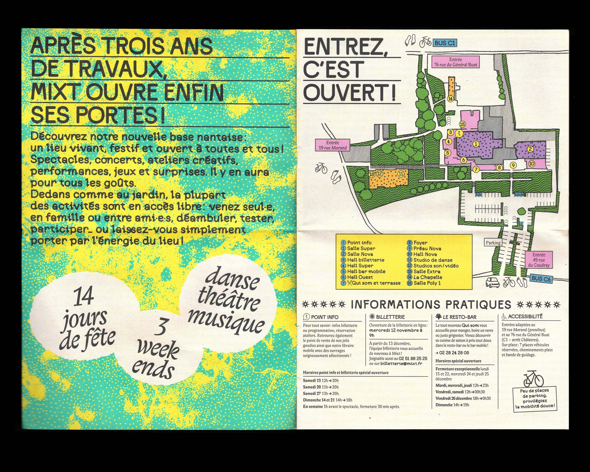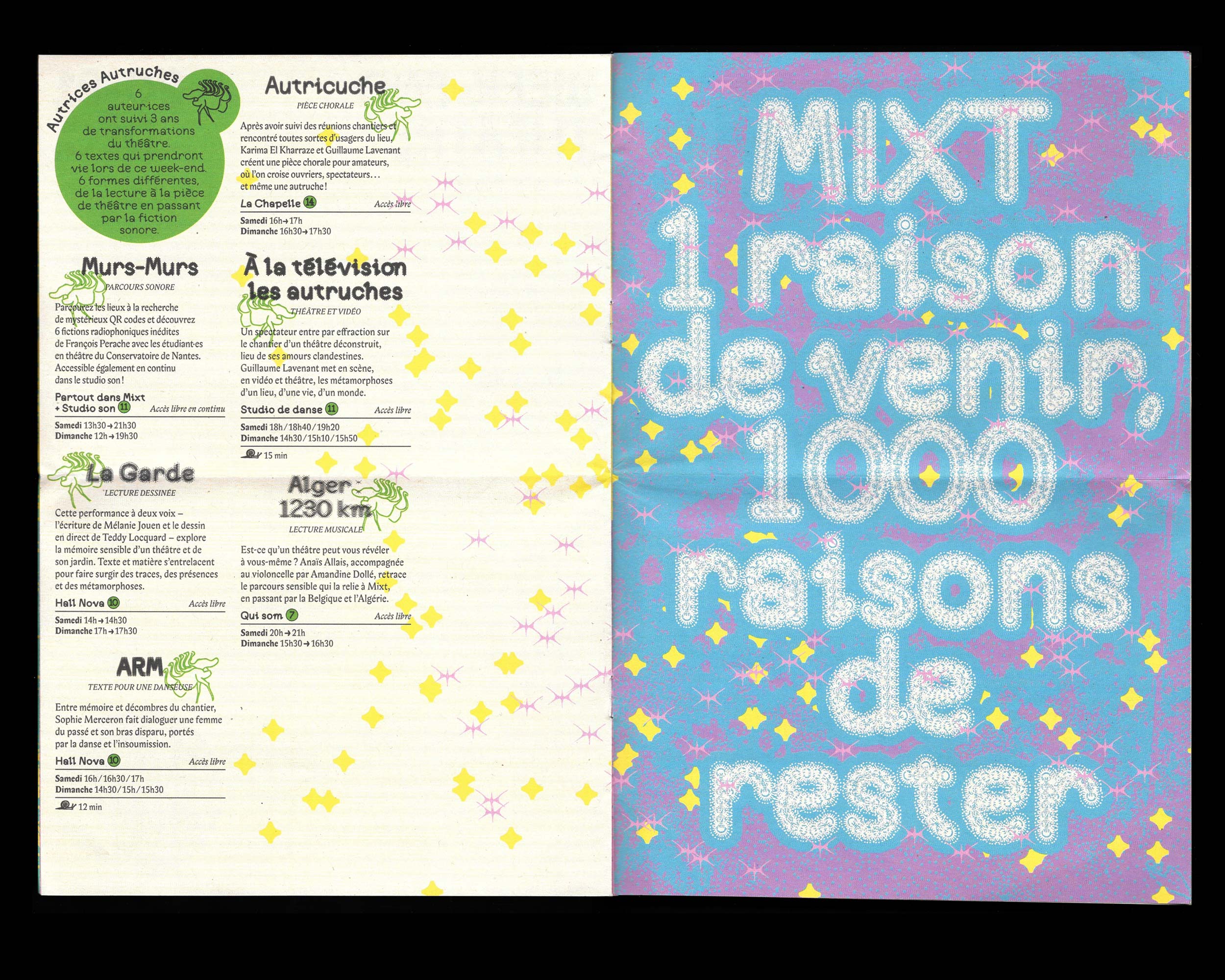 Programme des fêstivités du MIXT, nouveau théârte qui sort de terre, un jardin, un restaurant, un lieu de création, un lieu de convivialité ou nous retrouver.