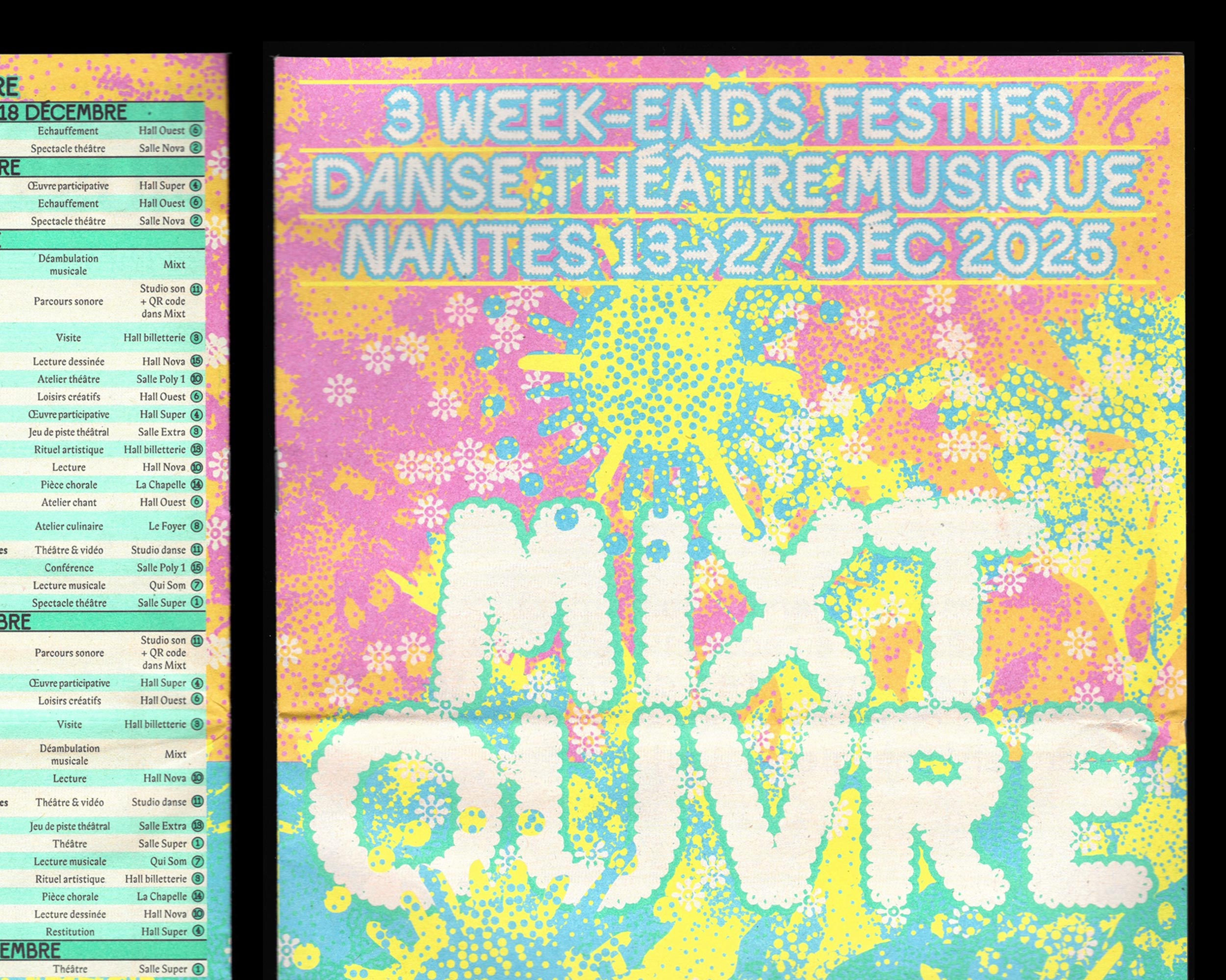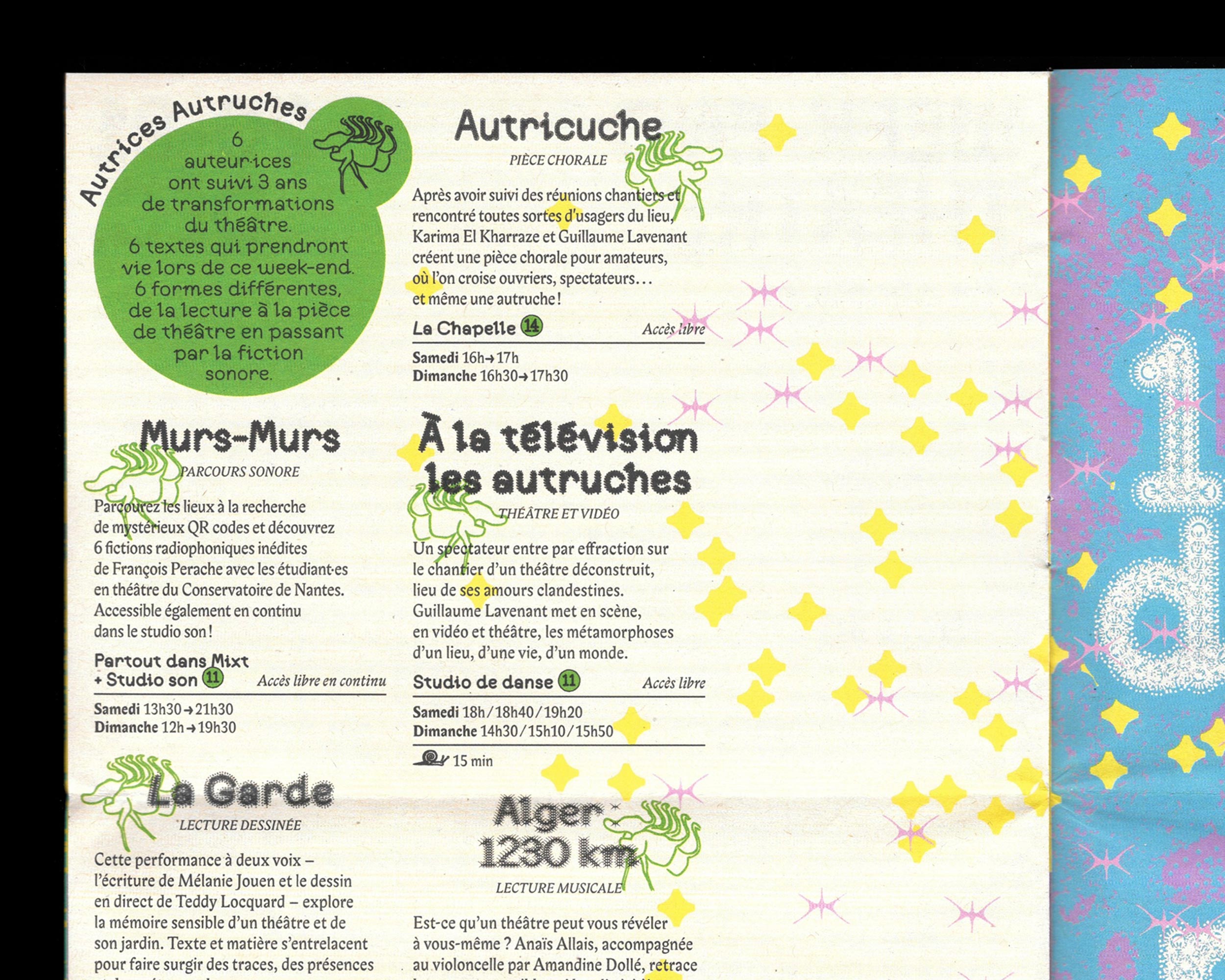 Programme des fêstivités du MIXT, nouveau théârte qui sort de terre, un jardin, un restaurant, un lieu de création, un lieu de convivialité ou nous retrouver.